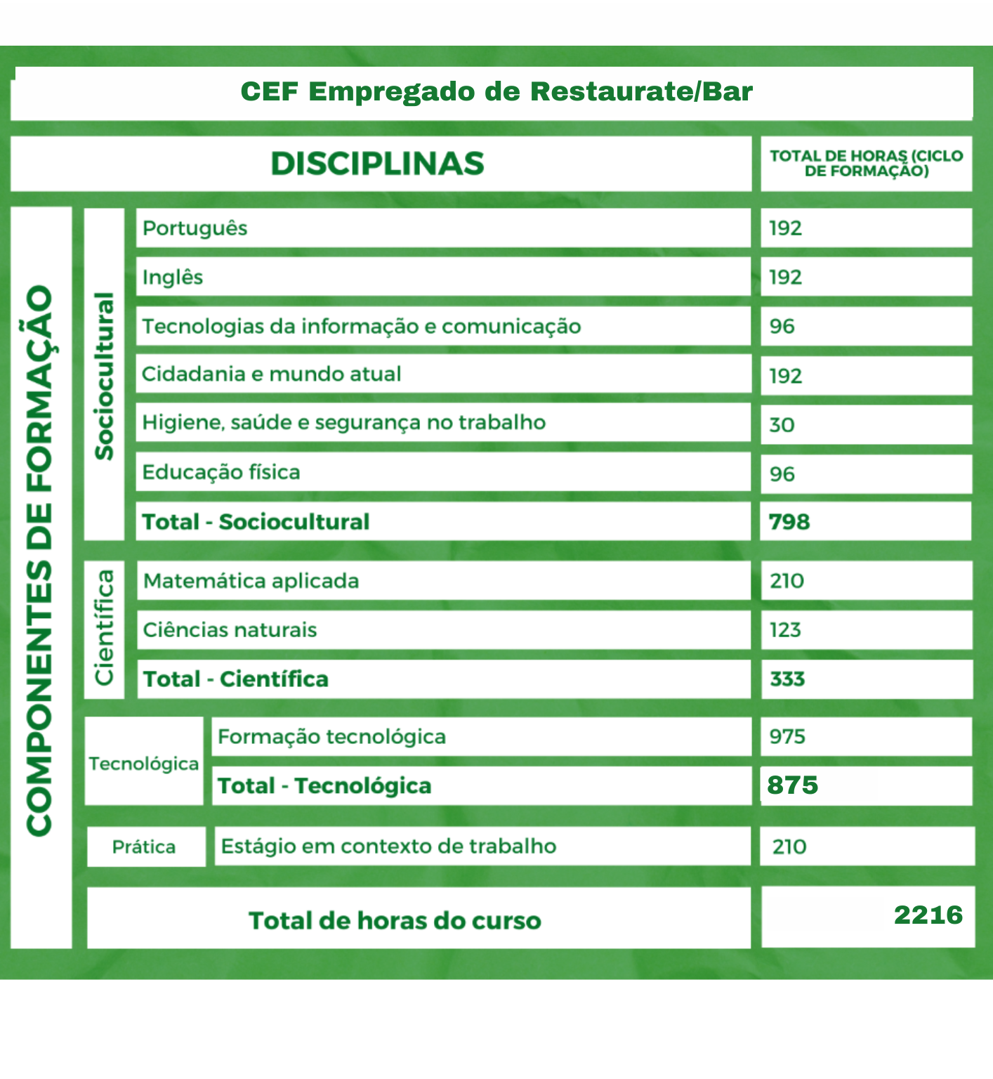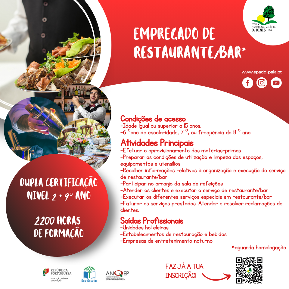 O Empregado de Restaurante/Bar é o profissional capaz de organizar, preparar e executar o serviço de restaurante/bar, respeitando as normas de higiene e segurança, em estabelecimentos de restauração e bebidas, integrados ou não em unidades hoteleiras, em cooperação com os demais elementos da equipa, com vista a garantir um serviço de qualidade e satisfação do cliente.