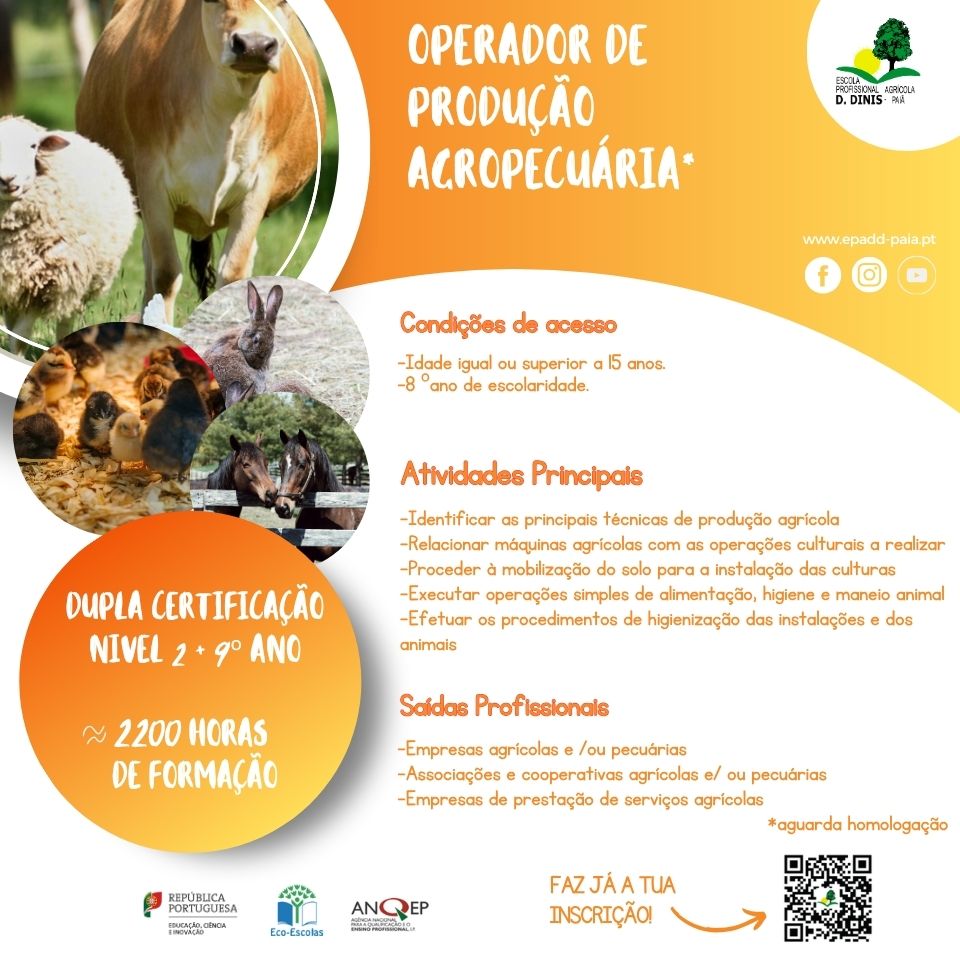O Operador de Produção Agropecuária é o profissional capaz de executar tarefas relativas à produção agrícola vegetal e animal, aplicando técnicas e métodos compatíveis com as necessidades das culturas e dos animais, garantindo a sua saúde e bem-estar, a preservação dos recursos naturais e a proteção ambiental. A atuação respeita as normas de qualidade dos produtos, de segurança alimentar e de segurança, higiene e saúde no trabalho.